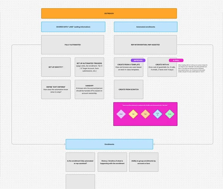 I held regular working sessions with my PM partner to ideate and scope solutions - we also co-led sessions with other product teams to define product boundaries and discuss questions and challenges. A key challenge was distinguishing this new product from existing prospecting tools and ensuring effective customer onboarding and product positioning. Together, we identified overlaps, addressed key questions, and aligned on a shared mission—while recognizing that our current tools weren’t fully meeting user needs, as confirmed by the research.